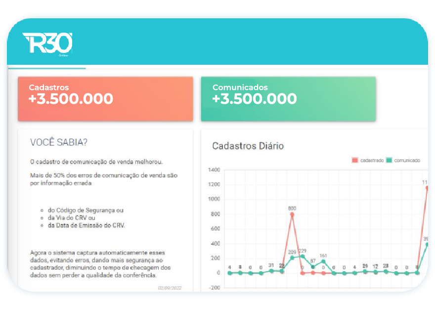 A R30 Online tem como objetivo proporcionar aos seus clientes segurança jurídica e segurança da informação, por meio de soluções tecnológicas como: RENAVE; Comunicação de Venda de Veículo; Validação Facial/Dados (integrado as Base de dados da CNH – Carteira Nacional de Habilitação e da RFB – Receita Federal do Brasil) e Registro de contrato de financiamento de veículo, junto ao DETRAN Estadual, entregando transparência, agilidade e qualidade